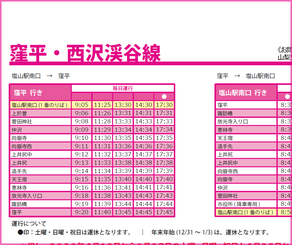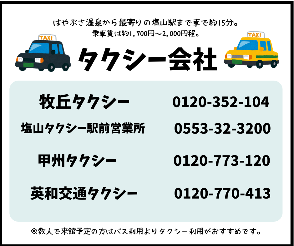| タクシー会社・連絡先 | バス停マップ | バス・時刻表 |