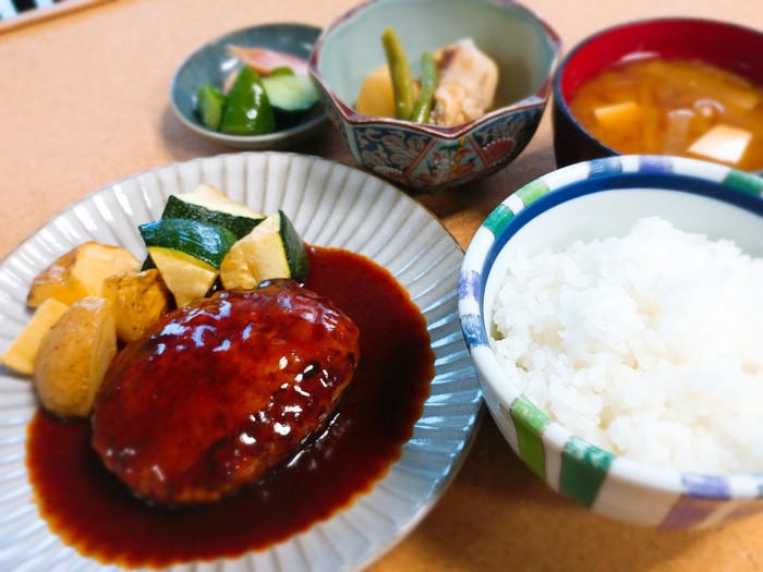 ![]() デミハンバーグ定食 (漬物、中鉢、味噌汁、ライス付き) |