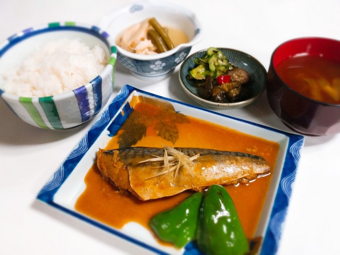 さばの味噌煮定食(漬物、中鉢、味噌汁、ライス付き) |